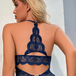 Odkryj swoją kobiecość w niezwykłej wersji! To eleganckie body z koronką w głębokim granatowym kolorze zachwyca artystycznym wzorem i uwodzicielskim, otwartym krojem. Zmysłowe wycięcia, delikatna kokardka do wiązania na szyi oraz urocza kokarda sprawiają, że ta bielizna jest idealnym towarzyszem na romantyczny wieczór lub specjalną okazję.