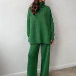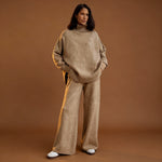 Nadanie swojemu codziennemu wyglądowi odrobiny ponadczasowej elegancji z zestawem garniturowym Otylia – harmonijne połączenie szlachetnego minimalizmu i bezwysiłkowej finezji. Zestaw łączy swobodnie skrojony sweter z prostymi spodniami, tworząc ponadczasową sylwetkę, idealną na relaksujące chwile lub stylowe wystąpienia.