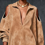 Nowoczesny design: Detal z odkrytymi ramionami dodaje modnego, stylowego akcentu do klasycznej sylwetki sukienki koszulowej, tworząc odważny, a zarazem kobiecy wygląd.