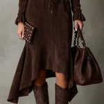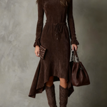 Elegancka Midi Sukienka z Ciemnobrązowego Zamszu z Sznurkiem to idealne połączenie wyrafinowania i współczesnego stylu. Wykonana z miękkiego sztucznego zamszu, ta midi sukienka posiada korzystnie wyglądający sznurek w talii, który pozwala na dostosowanie dopasowania, zachowując jednocześnie elegancki kształt. Asymetryczny dół dodaje nowoczesnego akcentu, a długie rękawy i luźny krój zapewniają komfort. Idealna na casualowe wyjścia lub wieczorne wydarzenia, ta sukienka oferuje elegancki, ale swobodny wygląd.