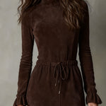 Alicja - Elegancka Midi Sukienka z Ciemnobrązowego Zamszu z Sznurkiem