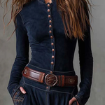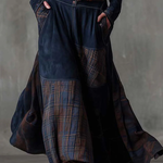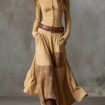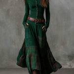 Ta wyjątkowa sukienka maxi łączy w sobie urok vintage z lekkością nowoczesnej elegancji. Miękki materiał z efektem zamszu otula sylwetkę, a dopasowana góra ze stójką i metalowymi guzikami tworzy wyrazisty, kobiecy wygląd. Rozkloszowany dół z panelem w brązowo-niebieską kratę dodaje całości charakteru i subtelnej artystycznej nuty.