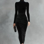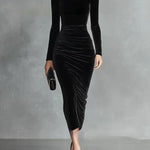 Sukienka Sophia jest uosobieniem wyrafinowanej elegancji wieczorowej. Stworzona, aby podkreślać sylwetkę dzięki gładkiemu, bezszwowego wykończeniu, jej luksusowa aksamitna tekstura uwydatnia każdą krzywiznę, zachowując jednocześnie aurę stonowanego glamour. Wysoki dekolt dodaje odrobiny wyrafinowania, doskonale zrównoważonego przez modelujące marszczenie w talii i na biodrach — tworząc pięknie wydłużoną sylwetkę, która jest zarówno pewna siebie, jak i urzekająca.