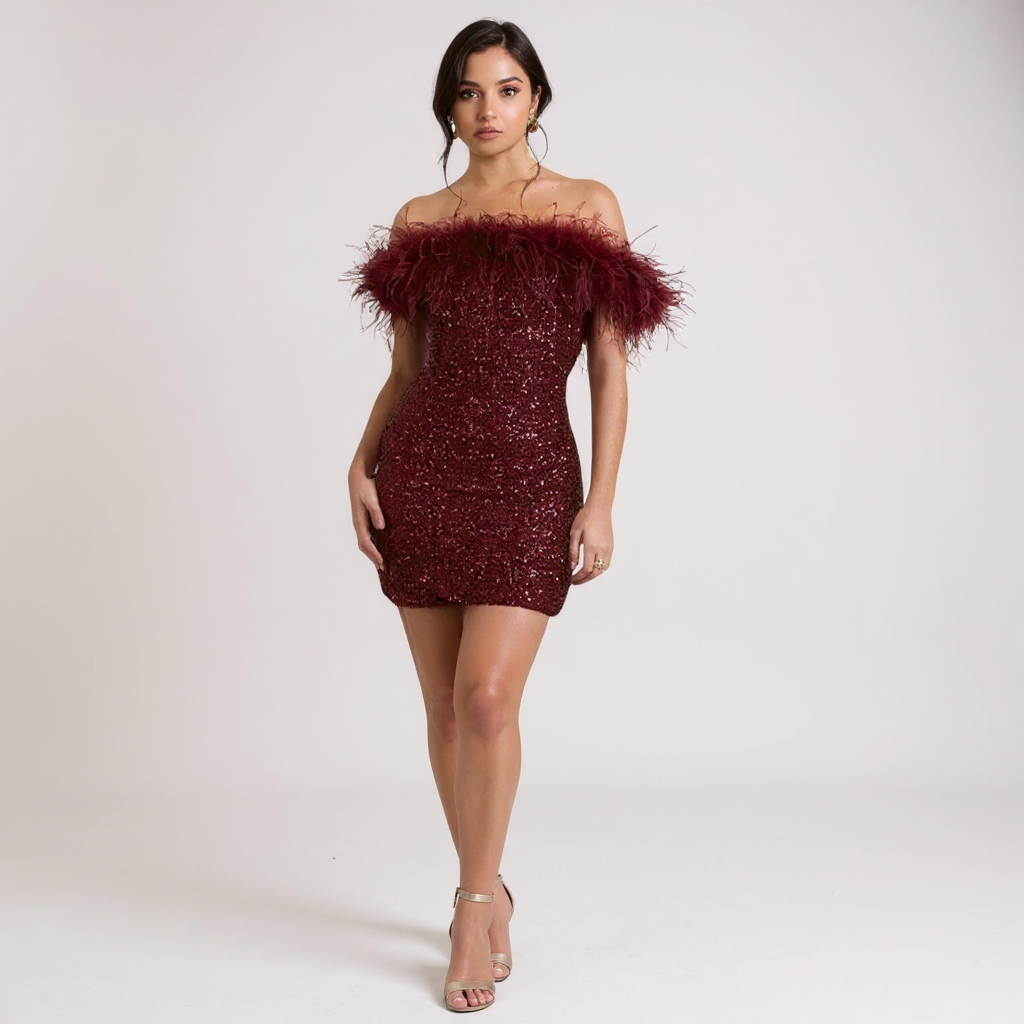 Ta olśniewająca sukienka ma dopasowany krój z glamourowym designem odkrytych ramion, ozdobionym miękkimi detalami z piór. Powierzchnia błyszczy dzięki całkowitemu wykończeniu cekinami, tworząc luksusową teksturę idealną na wieczorne wydarzenia. Zaprojektowana, aby przyciągać wzrok, ta sukienka łączy świąteczny urok z eleganckim stylem w korzystnej długości do połowy uda.