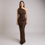 Suknia Elara ucieleśnia wyrafinowaną pewność siebie dzięki płynnemu satynowemu materiałowi i jednemu ramiączku. Tkanina porusza się z gracją przy każdym kroku, łapiąc światło w delikatnych, pochlebnych falach.