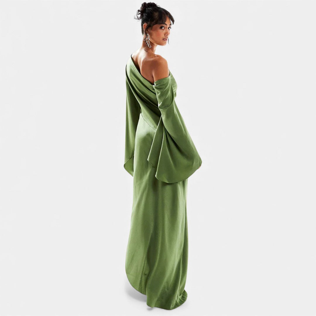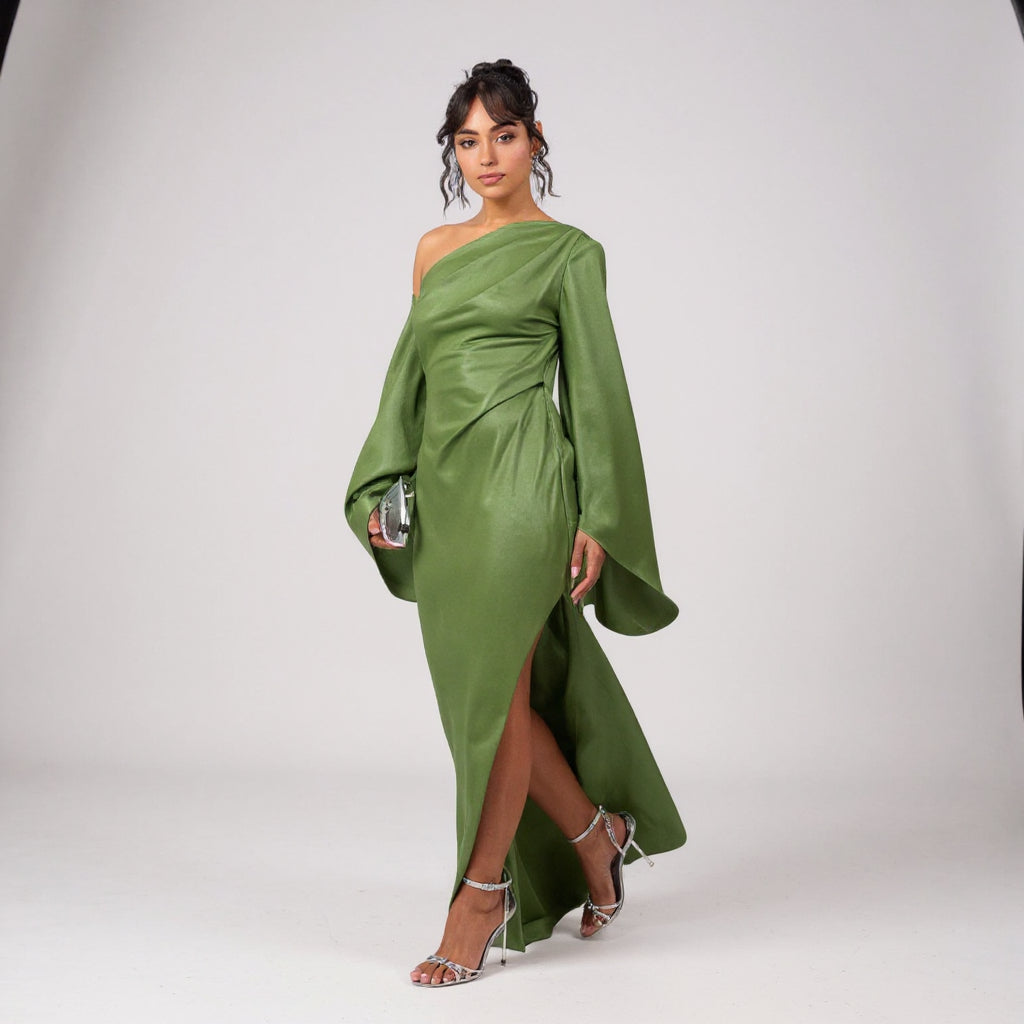 Ta uderzająca maxi sukienka ma asymetryczny dekolt na jedno ramię oraz pojedynczy drapowany rękaw, co dodaje dramatycznej elegancji. Dopasowany gorset podkreśla talię, a rozcięcie z przodu dodaje wdzięku i odrobiny uwodzenia. Jej gładkie satynowe wykończenie i płynny dół sprawiają, że jest to wyjątkowy wybór na specjalne okazje lub formalne spotkania.