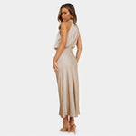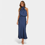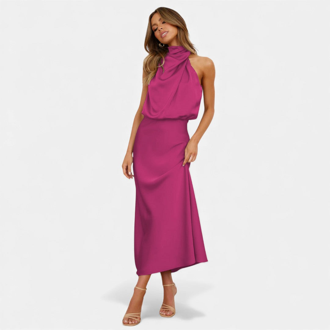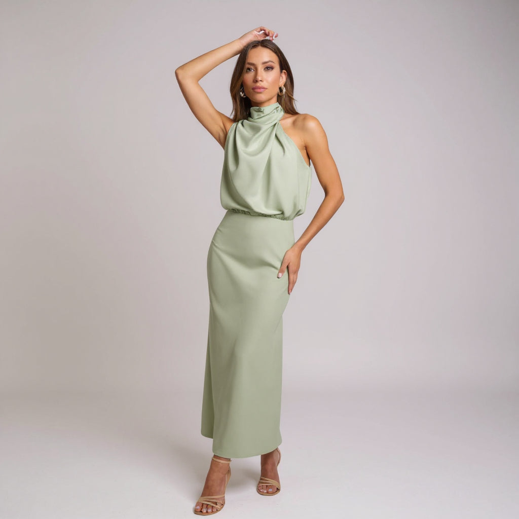 Ta bezrękawnikowa sukienka wieczorowa charakteryzuje się eleganckim, wysokim dekoltem z miękkim, drapowanym przodem, który dodaje eleganckiej objętości. Dopasowana talia przechodzi w gładką, sięgającą kostek spódnicę, która delikatnie opina ciało. Dzięki gładkiej, satynowej fakturze i czystej sylwetce, to dopracowany wygląd idealny na formalne kolacje, wesela lub specjalne wydarzenia.