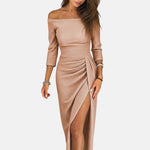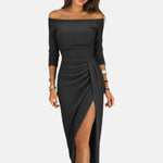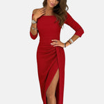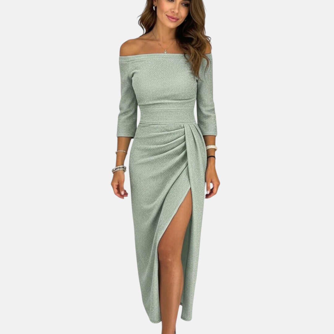 Design, który przyciąga spojrzenia – modne ramię odkryte i zmysłowy rozporek nadają charakteru.