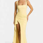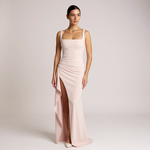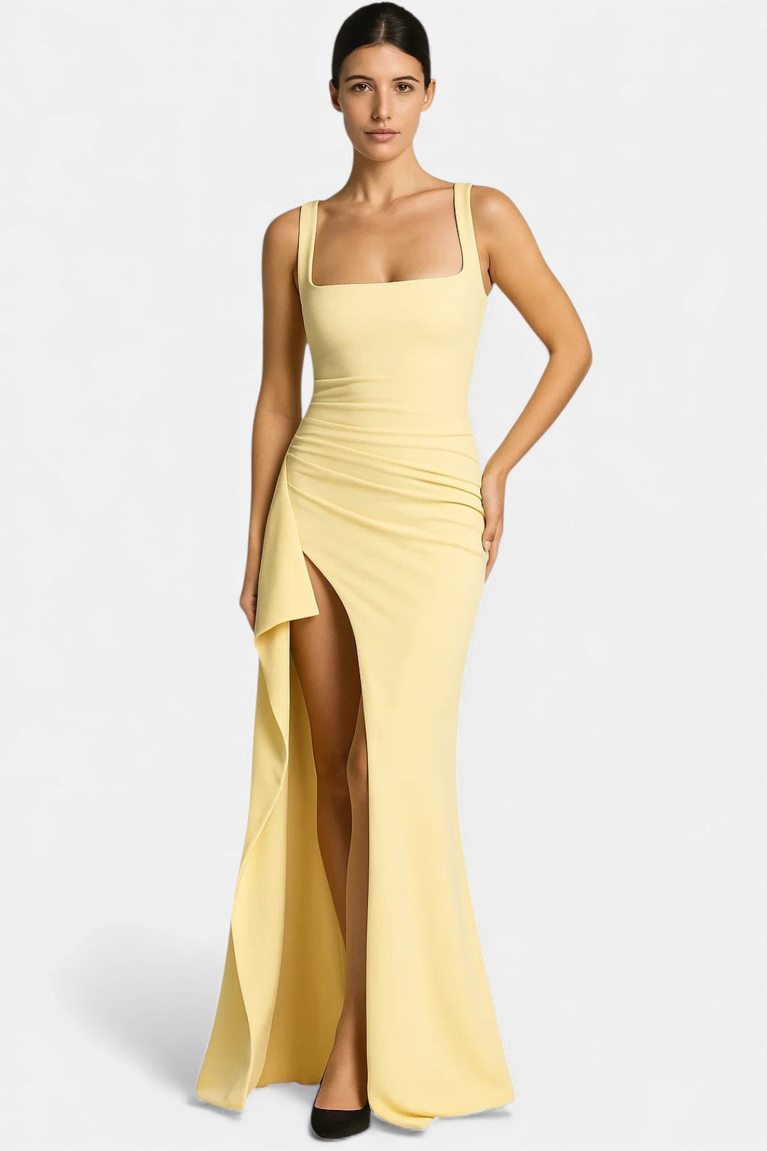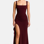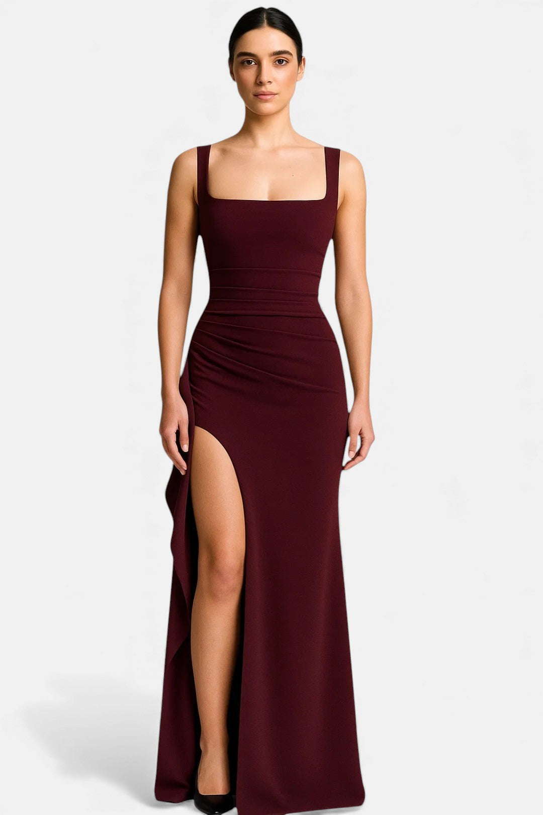 Ta dopasowana sukienka wieczorowa ma elegancki kwadratowy dekolt i grube ramiączka, co zapewnia czysty, strukturalny wygląd. Pięknie drapowany detal po bokach prowadzi do uderzającego rozporka do uda, tworząc dramatyczny ruch i kształt. Zaprojektowana, aby podkreślać sylwetkę bez zbędnego wysiłku, ta sukienka jest idealna na formalne wydarzenia lub wieczory, które robią wrażenie.