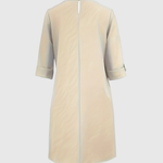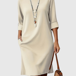 Zaprojektowana z myślą o chłodniejszych miesiącach, ta luźna sukienka pięknie opada w prostym, korzystnym kroju, który jest zarówno komfortowy, jak i elegancki. Miękka tkanina delikatnie opływa sylwetkę, nie przylegając, a podwinięte rękawy o długości 3/4 i okrągły dekolt dodają odrobiny stonowanej elegancji. Idealna na jesienne dni w biurze lub wieczorne spotkania, doskonale komponuje się z dopasowaną marynarką lub długim płaszczem — oferując ponadczasową elegancję przez wszystkie sezony.