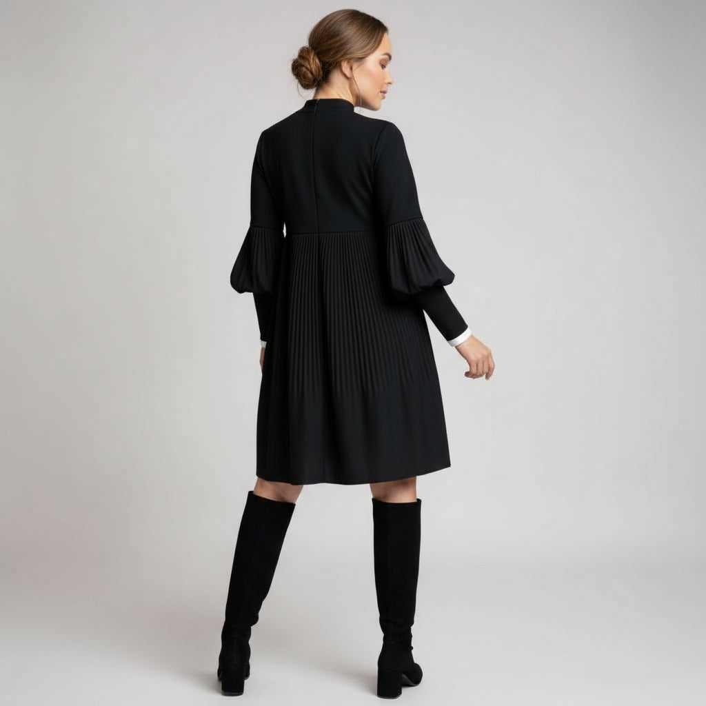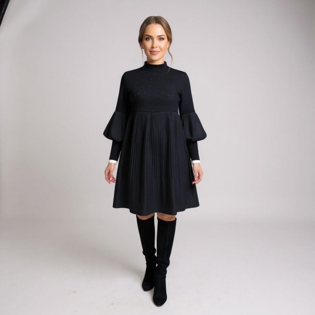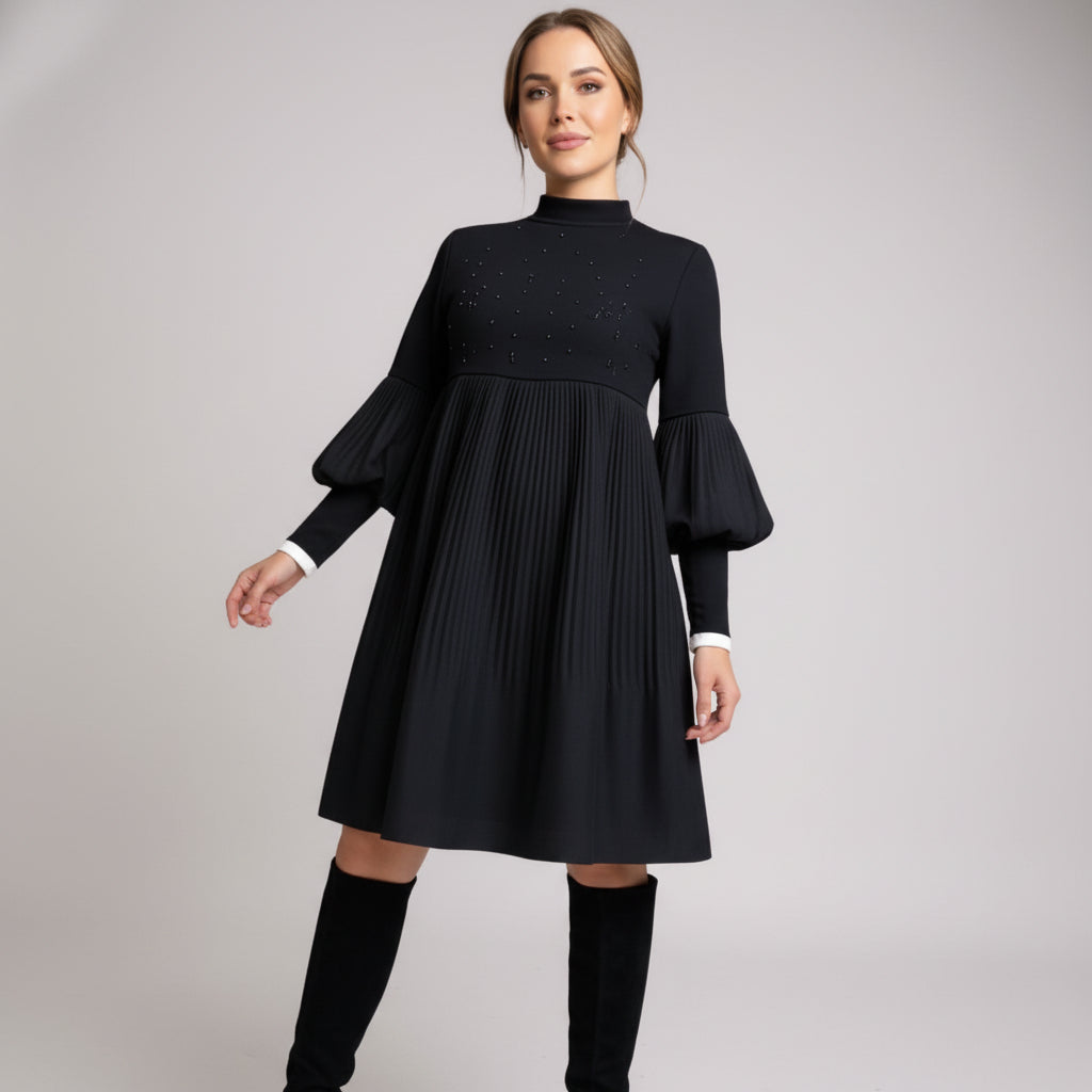Ta zwiewna sukienka ma wysoki dekolt, długie bufiaste rękawy oraz elegancką plisowaną dolną część, która dodaje ruchu i objętości. Górna część jest ozdobiona delikatnym haftem i subtelnymi zdobieniami, co dodaje odrobinę wyrafinowanego glamour. Dzięki luźnemu, a zarazem eleganckiemu krojowi, jest idealna zarówno na formalne okazje, jak i stylowe codzienne noszenie.