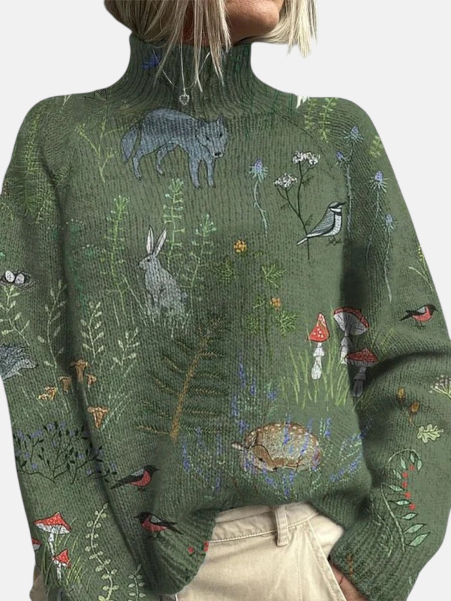 Ten wyjątkowy sweter przenosi Cię prosto do bajkowego lasu. Delikatny, miękki i pełen uroku – łączy w sobie artystyczny design z niezwykłym komfortem. Każdy detal opowiada historię natury, tworząc niepowtarzalny styl, który zachwyca subtelnością i charakterem.