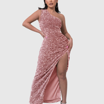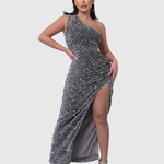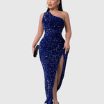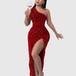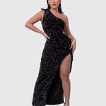 Ta glamourowa suknia na jedno ramię ma dopasowany krój, dramatyczne rozcięcie do uda i pełne zdobienia z cekinów. Długość do ziemi dodaje elegancji, a nowoczesny dekolt i smukła sylwetka tworzą efektowny wygląd. Idealna na formalne wydarzenia, gale lub specjalne uroczystości.