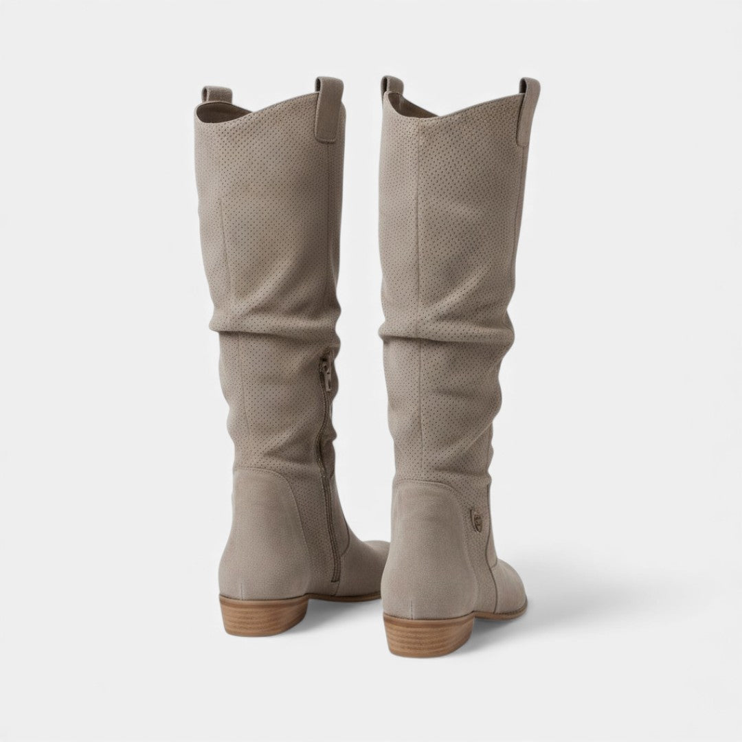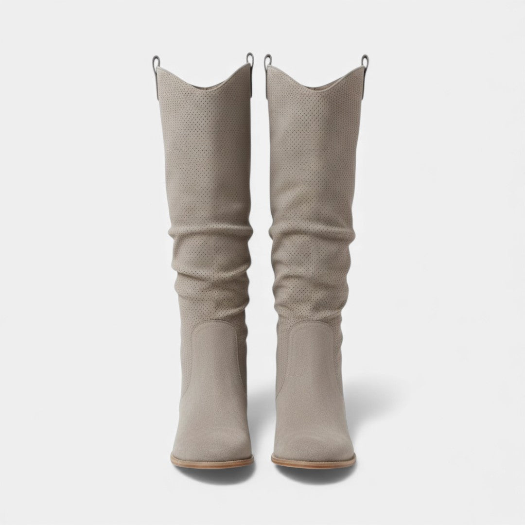 Vintage'owy styl z nowoczesnym akcentem, zaprojektowany, aby przyciągać uwagę na każdym kroku. Te kozaki za kolano łączą bohemską swobodę z wyrafinowaniem rzemiosła. Wykonane z miękkiej zamszowej skóry, mają luźną cholewkę z ażurową teksturą, która nadaje im rzemieślniczy urok. Niski blokowy obcas zapewnia komfort przez cały dzień, a boczny zamek błyskawiczny i klamra przy kostce dodają odrobinę elegancji. Wykończone spiczastym noskiem, są idealnym połączeniem łatwości i stylu.